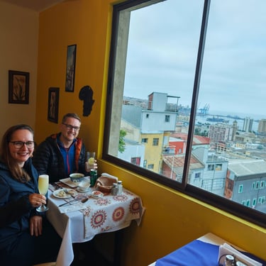 Nach dem Einchecken nutzen wir unseren Balkon, um in der Sonne die Füße hochzulegen. Am Abend finden wir ein kleines Restaurant, das sich eher wie ein gemütliches Wohnzimmer anfühlt. Mit Blick auf die Hafenbucht genießen wir frisch gefangenen Fisch und natürlich einen Pisco Sour. Später sitzen wir noch auf der Dachterrasse unseres Hotels. Mit einem Glas chilenischem Weißwein wird uns bewusst, wie weit wir bereits gereist sind: 32.300 Kilometer seit unserem Abflug in Düsseldorf.