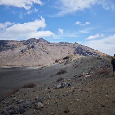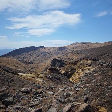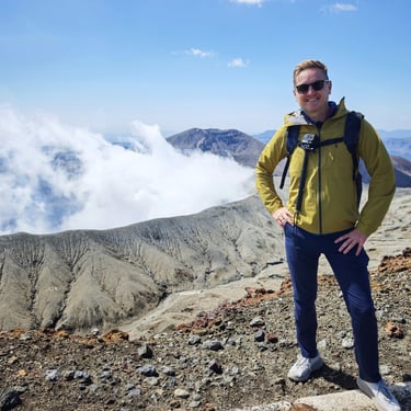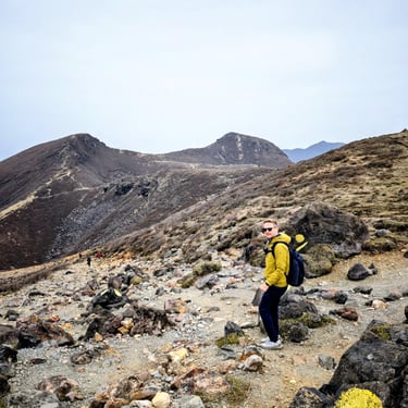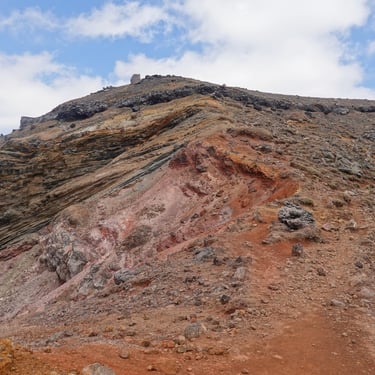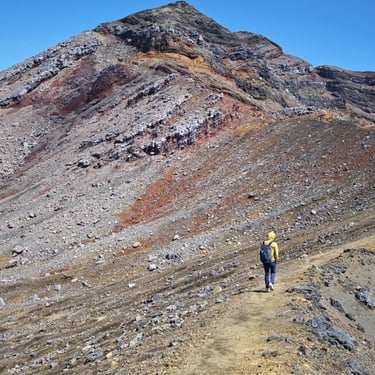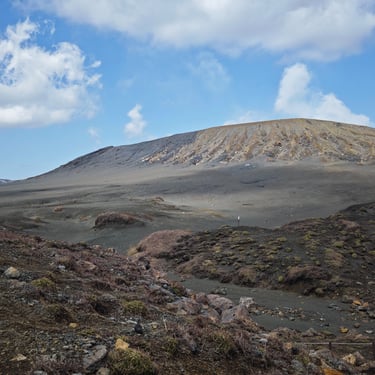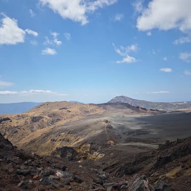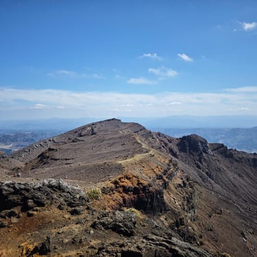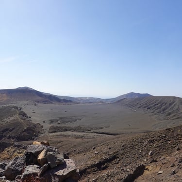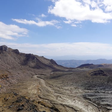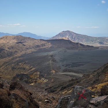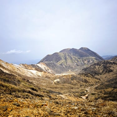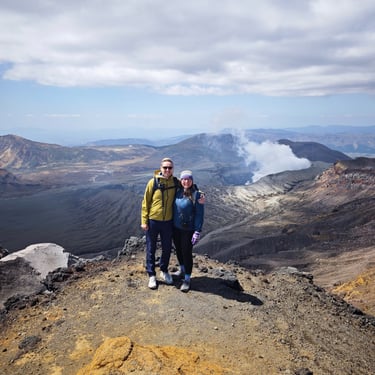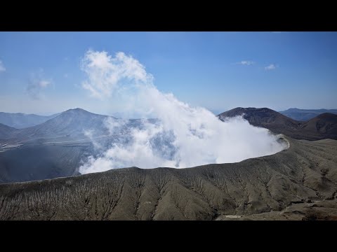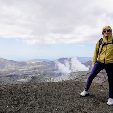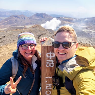 Die ersten Meter geht es noch durch die Büsche und ab einer kleinen Erhöhung wird der Wanderweg von Meter zu Meter immer krasser. Wir gehen über Asche und durch ein Farbenspiel an Mineralien, dafür ist die Landschaft nahezu vegetationslos. Jeder Schritt macht Spaß und als wir den steilsten Teil ansteuern, ist die Aussicht unsere Motivation. Und tatsächlich öffnet sich über dem Bergkamm die Aussicht in den Krater. Wir sehen wie die Dämpfe aufsteigen. Mount Aso, mit 1.592 Meter ist einer der größten aktiven Calderavulkane der Welt und wir sind echt baff bei der Aussicht. Sowohl die Caldera in als auch die Krater und die Landschaft dazwischen sind wunderschön anzusehen.