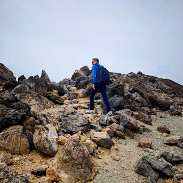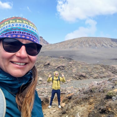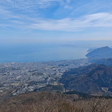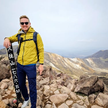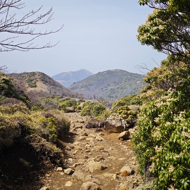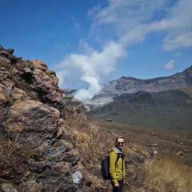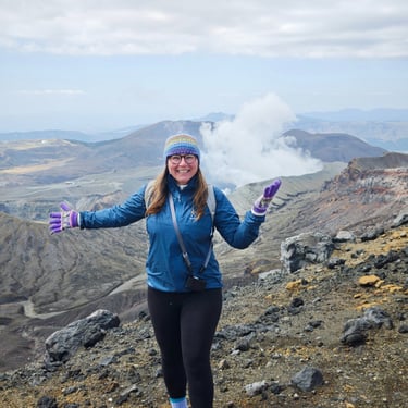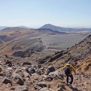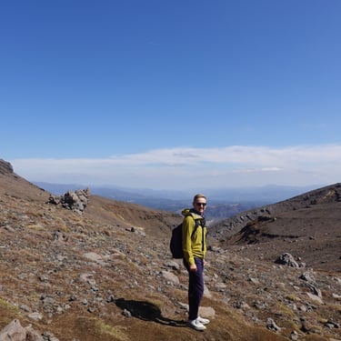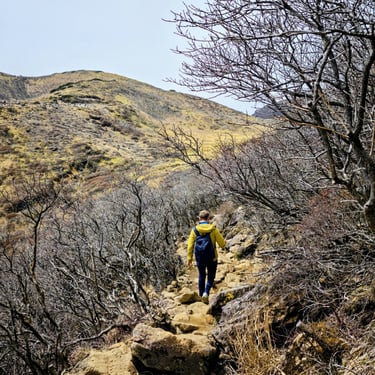 Es ist etwas befremdlich, dass viele Japaner:innen, denen wir begegnen, zum Teil komplett, inklusive Gesichtsschutz und Handschuhen, verdeckt sind, damit die Sonne bloß nicht die Haut berührt. Vom Gipfel aus können wir den heißen Vulkandampf sehen, der aus dem Berg kommt. Der Blick in die noch karge Landschaft lässt uns erahnen, wie herrlich grün und farbenfroh der Sommer hier sein kann.