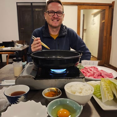 Unsere Unterkunft ist eine Holzhütte und liegt mitten im Wald. So abgeschieden gönnen wir uns eine Halbpension und bekommen zum Abendessen Sukiyaki, japanischen Beef Hot Pot. Welch ein Glück für uns, denn es ist einfach nur mega lecker. Wir köcheln langsam gut marmoriertes Rindfleisch zusammen mit Gemüse, Tofu und Pilzen in einem flachen Gusseisentopf. Die Suppenbrühe ist reichhaltig und voller süßer, salziger und herzhafter Aromen.