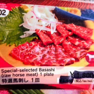 Abends kommen wir in Aso an und landen zum Essen in einer Seitengasse. Das kleine und ruhige Izakaya Restaurant mit abgetrennten Räumen bietet Platz auf Tatami-Matten und niedrigem Tisch. Hier gibt es auch die Spezialität der Region: rohes Pferdefleisch.
