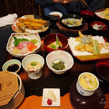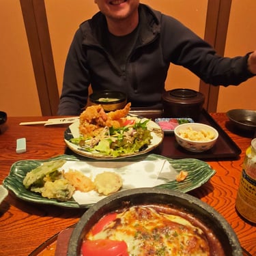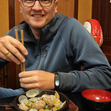 Der Besitzer vom Hostel empfiehlt uns ein 140 Jahre altes Kaiseki-Restaurant. Kaiseki ist ein traditionelles japanisches Menü mit mehreren Gängen, bei dem Saisonalität und ansprechende Präsentation im Vordergrund stehen. So kommt mein Menü auf einem großen Tablet und hat viele kleine Schüsseln mit leckerem Inhalt, wie Fisch, Sashimi, Miso-Suppe, Fischrogen und Chawanmushi. Das ist ein herzhafter, seidiger Eierstich, der gedämpft in einer Tasse serviert wird. Stephan genießt zunächst Muscheln, dann Tempura und eine frittierte Aubergine mit Hackfleisch in der Mitte. Dazu trinken wir Oolong-Tee und sitzen auf dem Boden.