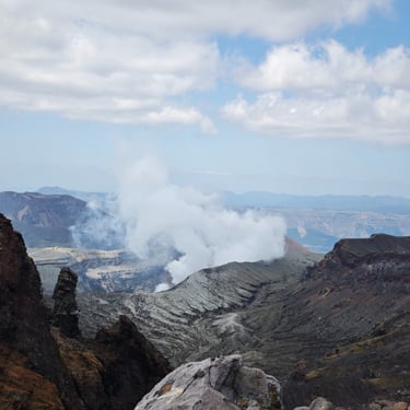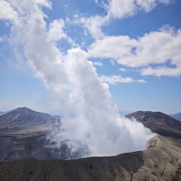 Unsere nächste Wanderung führt uns auf den Mount Aso, einen aktiven Vulkan. Zunächst erfahren wir im Hostel, dass es derzeit nicht möglich ist, zur Besucherplattform am Kraterrand zu gelangen. Im Januar ist ein Helikopter mit 3 Personen direkt über dem Krater abgestürzt und liegt seitdem dort. Aufgrund der Aktivitäten und der giftigen Dämpfe, war eine Bergung bisher nicht möglich. Nichtdestotrotz fahren wir hin und wandern los. Wir sehen, dass der direkte Weg und Zugang gesperrt ist.