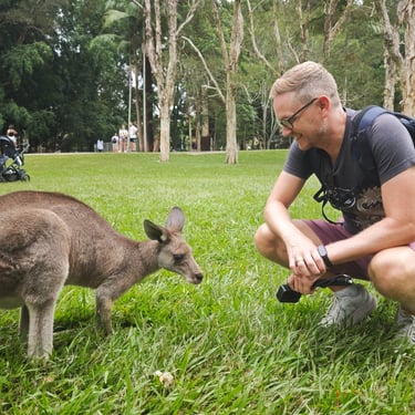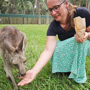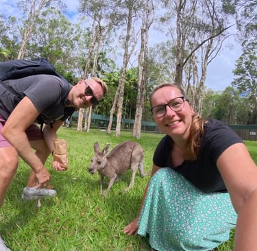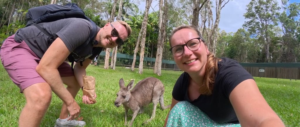 Endlich kommen wir Koalas und Kängurus ganz nah. Einen Koala kann ich sogar ganz vorsichtig am Hinterteil gestreicheln, denn dort spüren sie nichts. Gleichzeitig lernen wir mal wieder, wie wichtig Schutzprogramme in Australien sind: Bei den Buschfeuern 2019 sind in Queensland schätzungsweise 50 bis 70 Prozent der Koala-Population ums Leben gekommen, plus der tödlichen Infektionen, sind Koalas sehr gefährdet in ihrem Überleben. Die Koalas sind wirklich einfach zuckersüß und wir könnten ein eigenes Video und Fotogalerie eröffnen, denn es macht viel Spaß die Racker zu fotografieren und zu filmen. Ein weiteres Highlight sind die freilaufenden Kängurus, die uns entspannt aus der Hand fressen und sich streicheln lassen. Die abstehenden Vorderzähne machen das Füttern zu einer kitzligen Angelegehneheit. Die Wallabys bleiben dagegen scheuer und ihnen kann ich das Futter nur zuwerfen.
