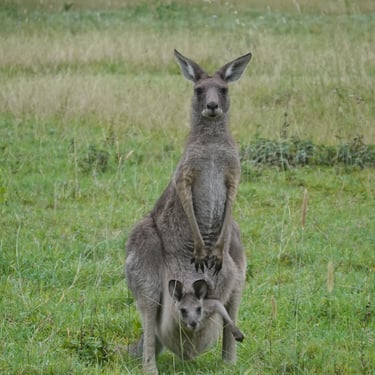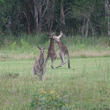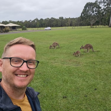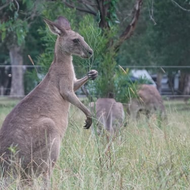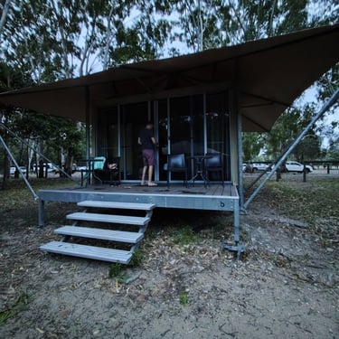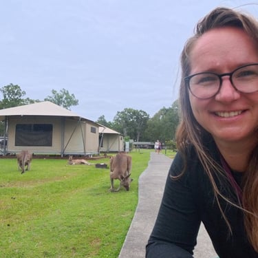 Ein ganz anderes Naturerlebnis erwartet uns im Habitat Noosa, wo wir mitten in der Wildnis campen beziehungsweise glampen. Offene Flächen, ein See, Wald und Tiere prägen das Gelände. Kängurus hüpfen ganz selbstverständlich direkt vor unserem Zelt vorbei. Die erste Nacht ist sehr windig, das Zelt raschelt unaufhörlich und hält uns wach.