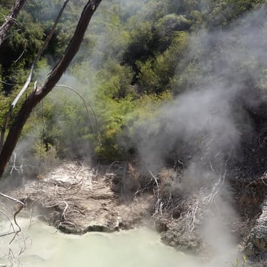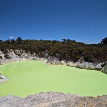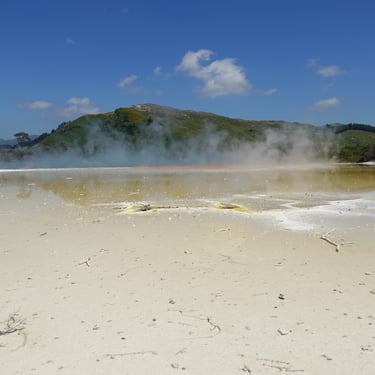 Der Besuch im Wai-o-Tapu Thermal- und Geologiepark ist ein Highlight. Die Vulkanregion erstreckt sich auf 250km und zählt zu den aktivsten Vulkanzonen der Welt. Die farbintensiven, brodelnden und dampfenden Becken sind faszinierend, allen voran der Champagne Pool, der mit 65 Meter Tiefe, 74 Grad heiß ist und in intensiven Farben schimmert.