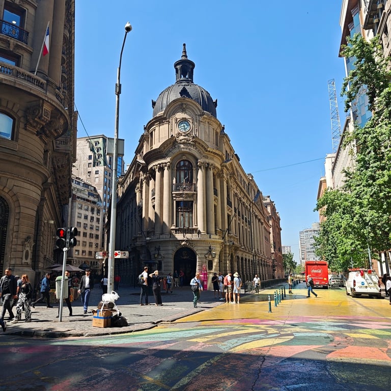 Die Architektur in der Innenstadt/Altstadt erinnert an New York, das den Architekten als Vorbild gedient hat. Es gibt zahlreiche Gebäude, die den Stil der 30er Jahre kopiert haben und so auch in Manhattan stehen könnten. Santiagos Bezirke werden unabhängig voneinander verwaltet und dies hat drastische Auswirkungen. Den wohlhabenderen Stadtteilen stehen erheblich mehr Mittel für z.B. Sicherheit oder Straßenreinigung zur Verfügung. Tendenziell gilt: Je weiter westlich, desto ärmer und je weiter östlich, desto reicher sind die Einwohner. Während der Plaza de Armas und direkt umliegende Straßen noch einen gepflegten Eindruck machen, ändert sich dieser Eindruck schnell, als wir mal ein paar Straßen in die "falsche" Richtung gehen. Chile ist zwar vergleichweise wohlhabend und der Eindruck von San Pedro de Atacama hat sich durchaus bestätigt. Aber das heisst nicht, dass es hier nicht auch Armut gibt. Tatsächlich beobachten wir live wie ein Mann versucht, einer Touristin unserer Gruppe während der Stadtführung die Kette vom Hals zu reißen. Mitten am Tag während wir über die Ampel gehen!