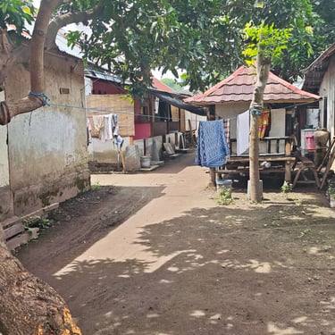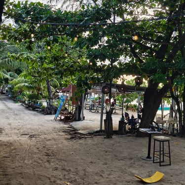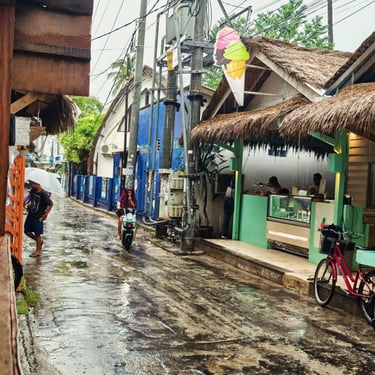 Nach den ersten 3 Tagen ziehen wir um. Auf dem Weg zu unserer neuen Unterkunft laufen wir durch das Dorf und kommen an der Grundschule, der Moschee und einigen Wohnhäusern vorbei. Meist sitzen Frauen mit ihren Kindern davor. Die Mitte der Insel ist weiterhin vom alltäglichen Leben der Insulaner, während es in Strandnähe die Angebote für Touristen gibt. Unsere Bungalowanlage mit Pool ist eine tolle Oase. Wir fühlen uns so wohl, dass wir entscheiden noch 2 weitere Tage auf Gili Air zu verbringen. Der Tag plätschert vor sich hin und als am Nachmittag der Regen einsetzt, setzen wir uns ein ein Bambushaus bei Cappuccino und Matcha Latte. Beim Abendessen spielen wir und hören dem Regen zu.