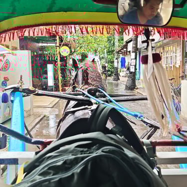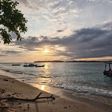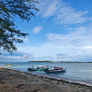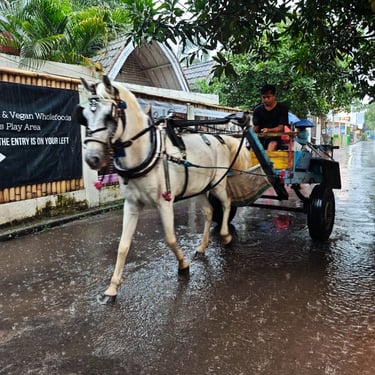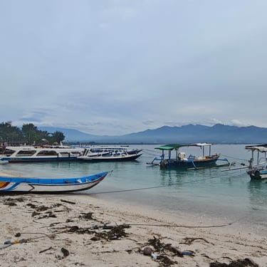 Die Überfahrt nach Gili Air ist wellig. Starker Wind und Regen lassen das Boot ordentlich schwanken und im Hafenbecken schwimmt viel Müll. Auf Gili Air selbst gibt es keinen motorisierten Verkehr, stattdessen werden wir mit einer Pferdekutsche über die Insel gefahren. Die kurze Strecke zum Norden der Insel ist überraschend teuer. Der erste Eindruck ist dennoch positiv: klein, ruhig, entspannt. Der Vibe der Insel ist sofort spürbar. Was wohl auch daran liegt, dass wir in der Nebensaison hier sind und die Insel eher leer.