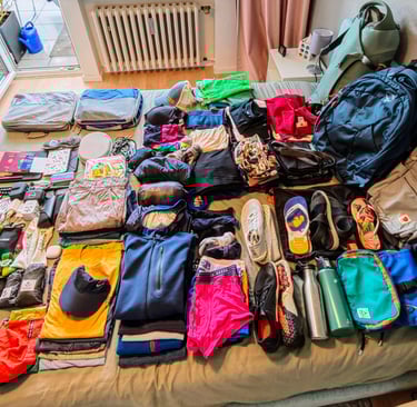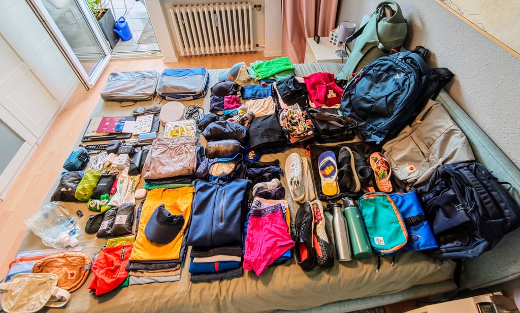 wasserdichte Dokumententasche, Hüfttasche, geheime Hüfttasche, faltbare Plastikflaschen, faltbarer Beutel, faltbare Hüfttasche + Rucksack, Wäschekordel, Taschenmesser, Stirnlampe, aufblasbare Nackenkissen, Reisebesteck, faltbare Behälter (im Bild vergessen), faltbare Picknickdecke, Reiseadapter, Ladegeräte und Kabel, Kamera, Action-Kamera, Tablet, Tripod, Zubehör, Powerbank, E-Reader, Pässe, internationale Führerscheine, Passfotos, Sonnenbrillen, Kopfhörer, Trinkflaschen Metall, Medikamententasche, kleine Schlösser, Mikrofaser Handtücher (2x klein, 2x groß)
