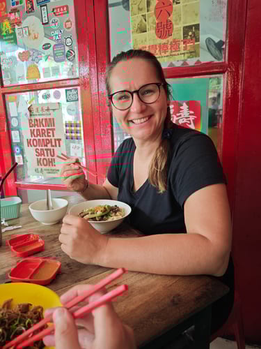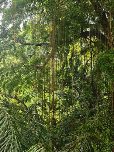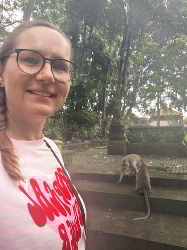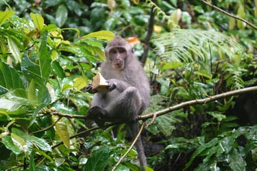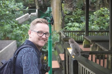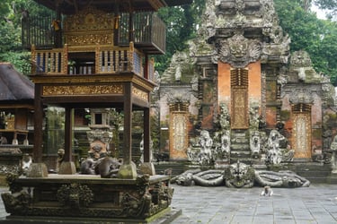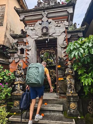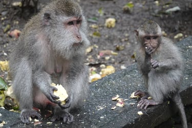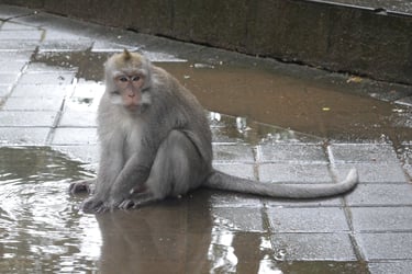 Am ersten Abend gehen wir gemeinsam zum Faszien-Yoga. Für Stephan ist es die erste bewusste Begegnung mit Yoga, für mich inzwischen ein fester Bestandteil der letzten Wochen. Kurz darauf setzt der Regen ein, der uns nun mehrere Tage begleiten wird. Am nächsten Tag schlendern wir durch den Markt von Ubud mit all seinen Souvenirständen, besuchen den Palast und gehen anschließend in den Monkey Forest. Rund 1.100 Makaken leben hier in einem geschützten Waldgebiet mitten in der Stadt. Zwischen Tempelruinen und riesigen Bäumen klettern sie über Geländer, sitzen auf Mauern und beobachten neugierig die Gäste.