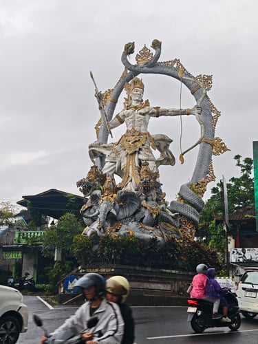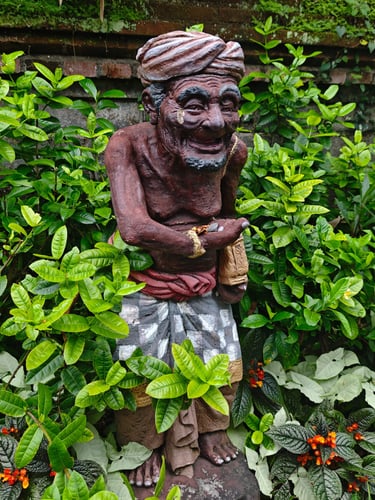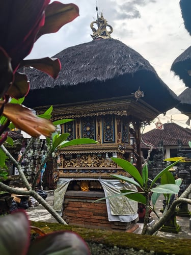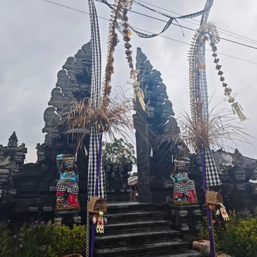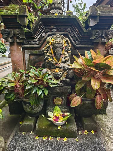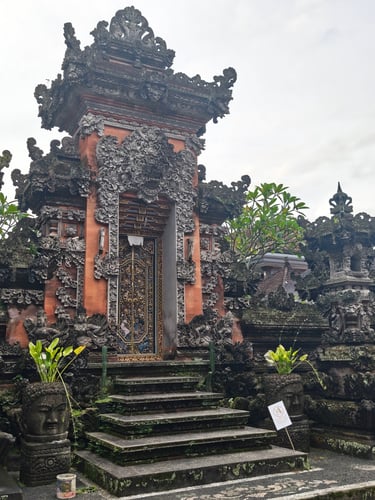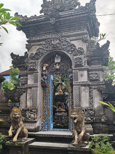Je länger wir auf Bali sind, desto deutlicher sehen wir, wie sehr Religion hier den Alltag prägt. Opfergaben gehören zum Stadtbild, stehen vor Haustüren, auf Treppenstufen, am Straßenrand. Fast täglich entdecken wir irgendwo Balinesen, die sich traditionell gewandet für ein religiöses Fest versammeln. Tempel und Schreine sind allgegenwärtig, sie sind fester Teil der Architektur. Viele Figuren sind bunt bemalt und prachtvolle Tore goldverziert. Die Übergänge von öffentlichen Stätten zu Privaträumen sind fließend. Oft wissen wir gar nicht, ob es sich um einen Tempel oder um ein Privathaus handelt, so überschwänglich sind Türen, Mauern und Gärten verziert.