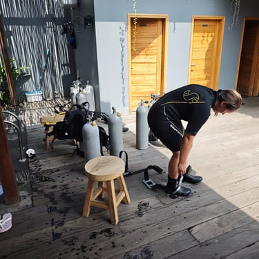 Mit jedem Tauchgang ist bei mir die Freude gestiegen, in eine andere Welt einzutauchen. Nach der bestandenen Theorieprüfung, alles über ein tolles E-Learning, mache ich noch einen Fun Dive mit Ronald, dem Besitzer des kleinen Resorts. Dank all dem Neuerlernten macht es immer mehr Spaß, sich unter Wasser zu bewegen und den vielen verschiedenen Fischen zuzuschauen. Von Kugelfischen, über Moränen bis zu Clownfischen ist ganz viel dabei. Einmal halten wir so ruhig unsere Balance unter Wasser, dass ein Fisch an meinem Finger knabbern kann.