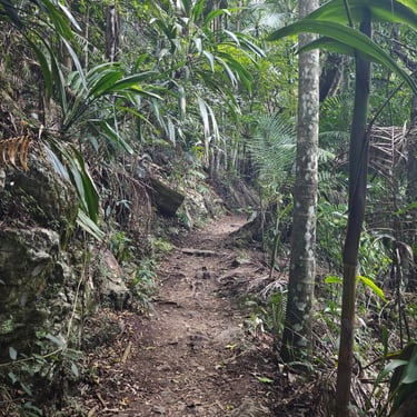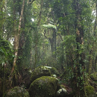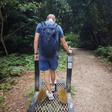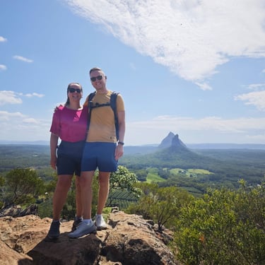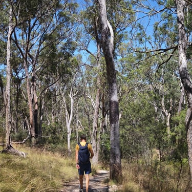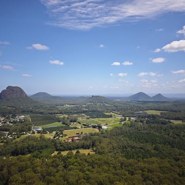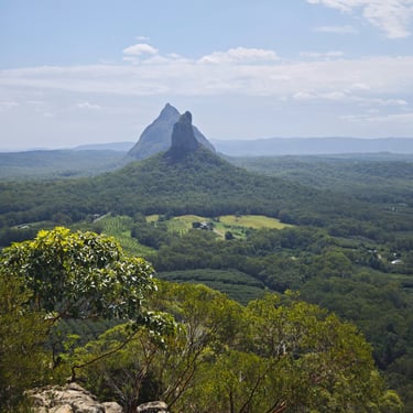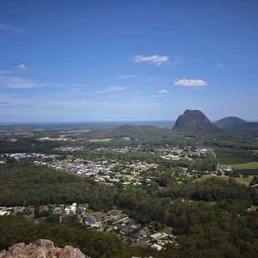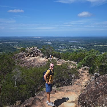 Danach zieht es uns noch in den Glass House Mountains Nationalpark, wo wir auf den Mount Ngungun wandern. Auch hier müssen wir an Geräten wieder unsere Schuhe zum Schutz des Waldes reinigen. Vom Gipfel aus blicken wir über eine markante Vulkanlandschaft, deren einzelne Berge wie zufällig aus der Ebene wachsen.