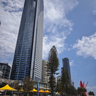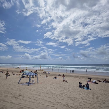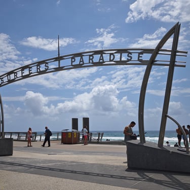 Der Ort Surfers Paradise macht seinem Namen alle Ehre. Die Zahl der Surfer ist hoch, die der oben ohne laufenden Männer ebenfalls. Hochhäuser, Strand und Sonne bringen eine interessante Stimmung zusammen.