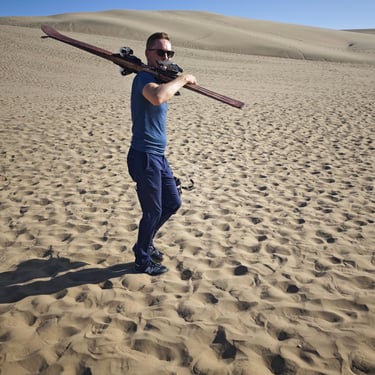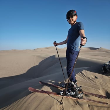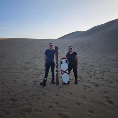 Wir sind in der Gruppe etwa 10 Personen und fahren zunächst ein paar Aussichtspunkte ab. Danach wird's spannend als wir am ersten Abhang halten und es entweder mit dem Board auf dem Bauch bergab geht oder wie ich auf den Skiern. Und was soll man sagen? Das hat gut geklappt und richtig Spaß gemacht! Am Anfang fühlen sich die Ski wie angeklebt an, aber sobald man eine gewisse Geschwindigkeit erreicht, fährt es sich fast wie auf Schnee. Schade, dass die Hänge der Dünen zu kurz sind, um richtig in Fahrt zu kommen. Allerdings ist es extrem anstrengend, die Hügel in Skischuhen wieder hochzulaufen, so dass es insgesamt bei nur wenigen Abfahrten bleibt. Dennoch war das ein besonderes Erlebnis, das darüber hinwegtröstet hat, dass wir von Kopf bis Fuß voller Sand waren.